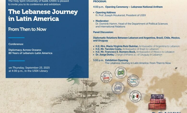 نظّمت جامعة الروح القدس – الكسليك مؤتمرًا بعنوان: “الدبلوماسية عبر المحيطات: 80 عامًا من العلاقات اللبنانية – الأميركية اللاتينية”، تلاه افتتاح معرض تحت عنوان: “رحلة اللبنانيين في أميركا اللاتينية: من الماضي إلى الحاضر”، في مكتبة الجامعة، بحضور سفيرة الأرجنتين في لبنان ماريا فيرجينيا رويس قنطار، سفير البرازيل في لبنان تارسيزيو كوستا، سفير المكسيك في لبنان فرانسيسكو روميرو بوك، القائم بالأعمال بالنيابة لجمهورية الأوروغواي في لبنان جورجي دوتا، إلى جانب شخصيات دبلوماسية ونقابية وأكاديمية وثقافية…