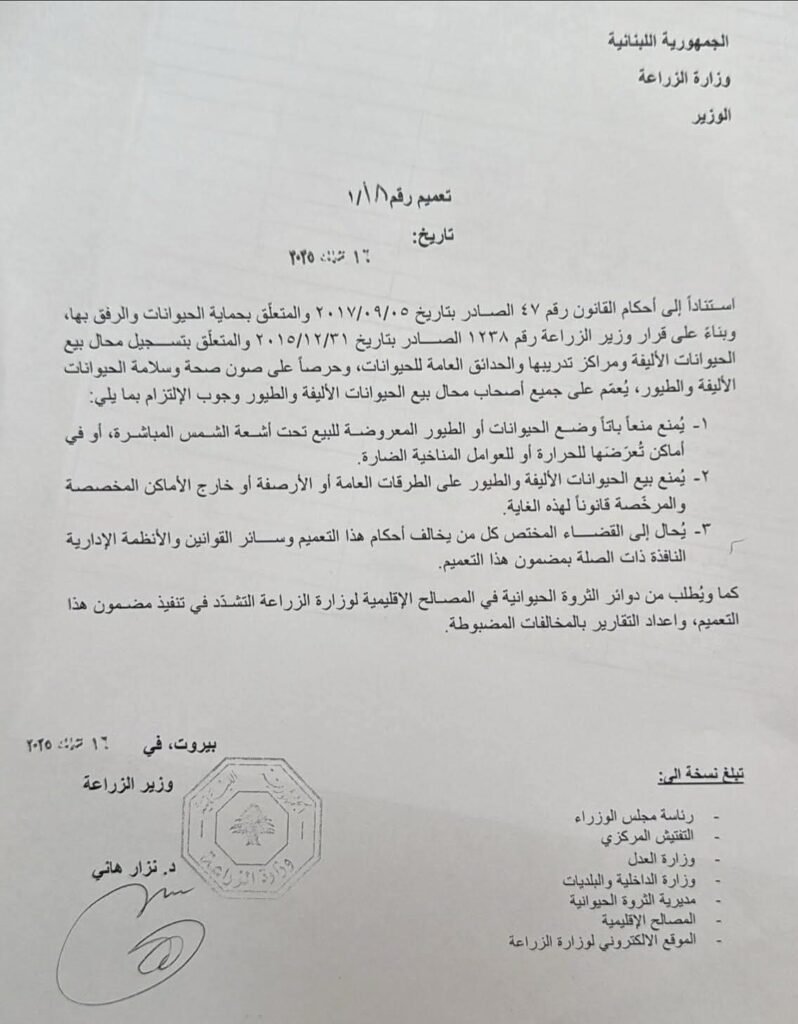 أصدر وزير الزراعه الدكتور نزار هاني تعميمًا يحمي بموجبه صحة وسلامة الحيوانات الأليفة والطيور.